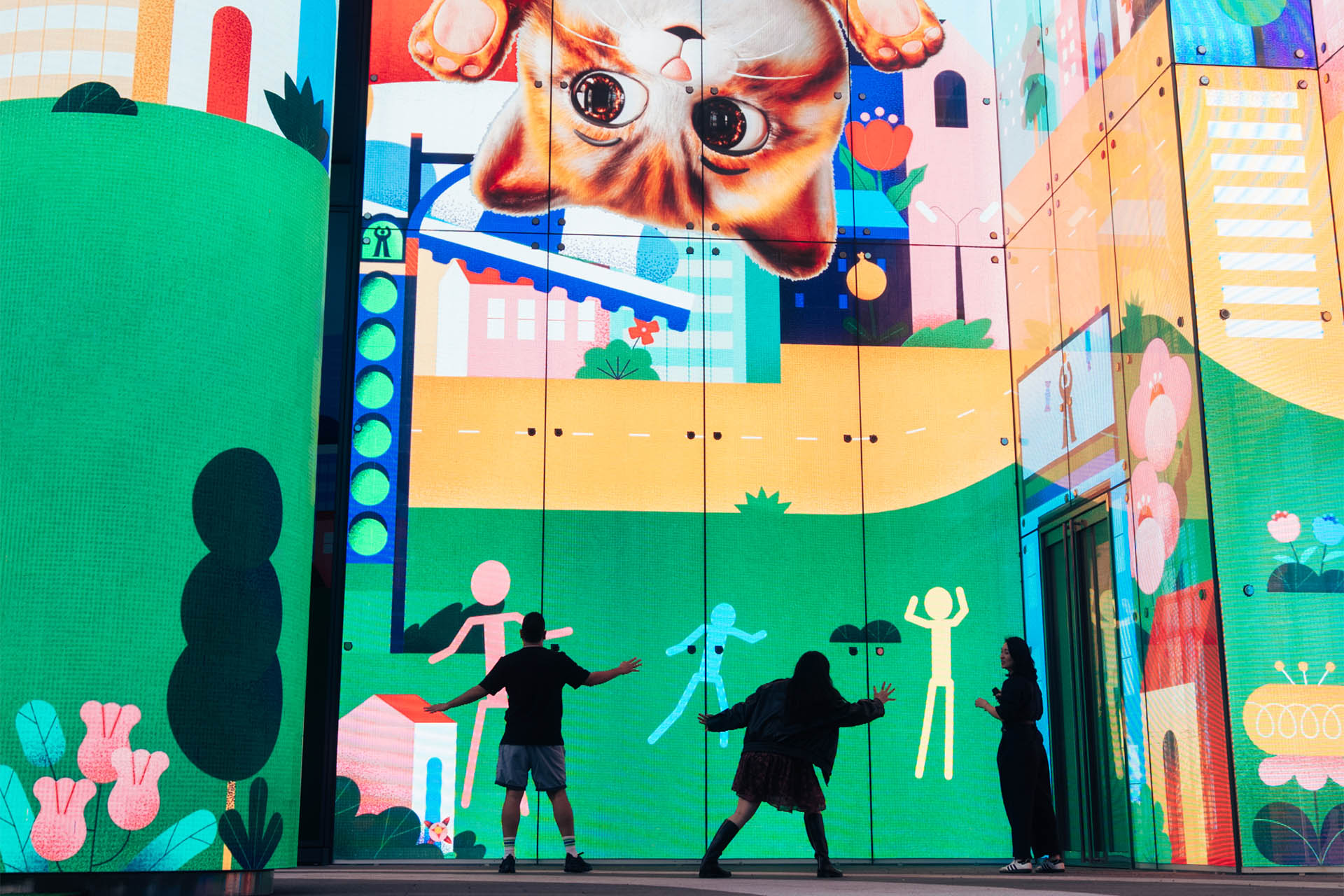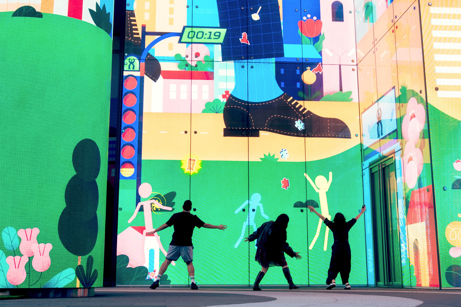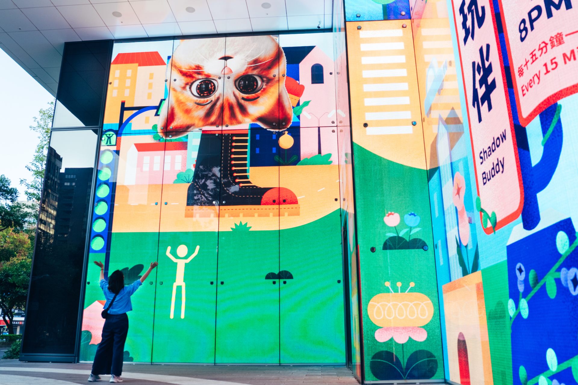 升級版本中,畫面會切換為巨人視角,一雙巨大腳步跨越光廊,重新拉開人與街景間的比例關係;聖誕限定的禮物雨 Gift Shower 場景,更讓人忍不住伸手接住從天而降的泰迪熊與糖果;隨後 LUMi 小石虎還會驚喜現身揮手。互動當下,台北街道成為「可玩的風景」,而你其實正在參與創作藝術的一環!