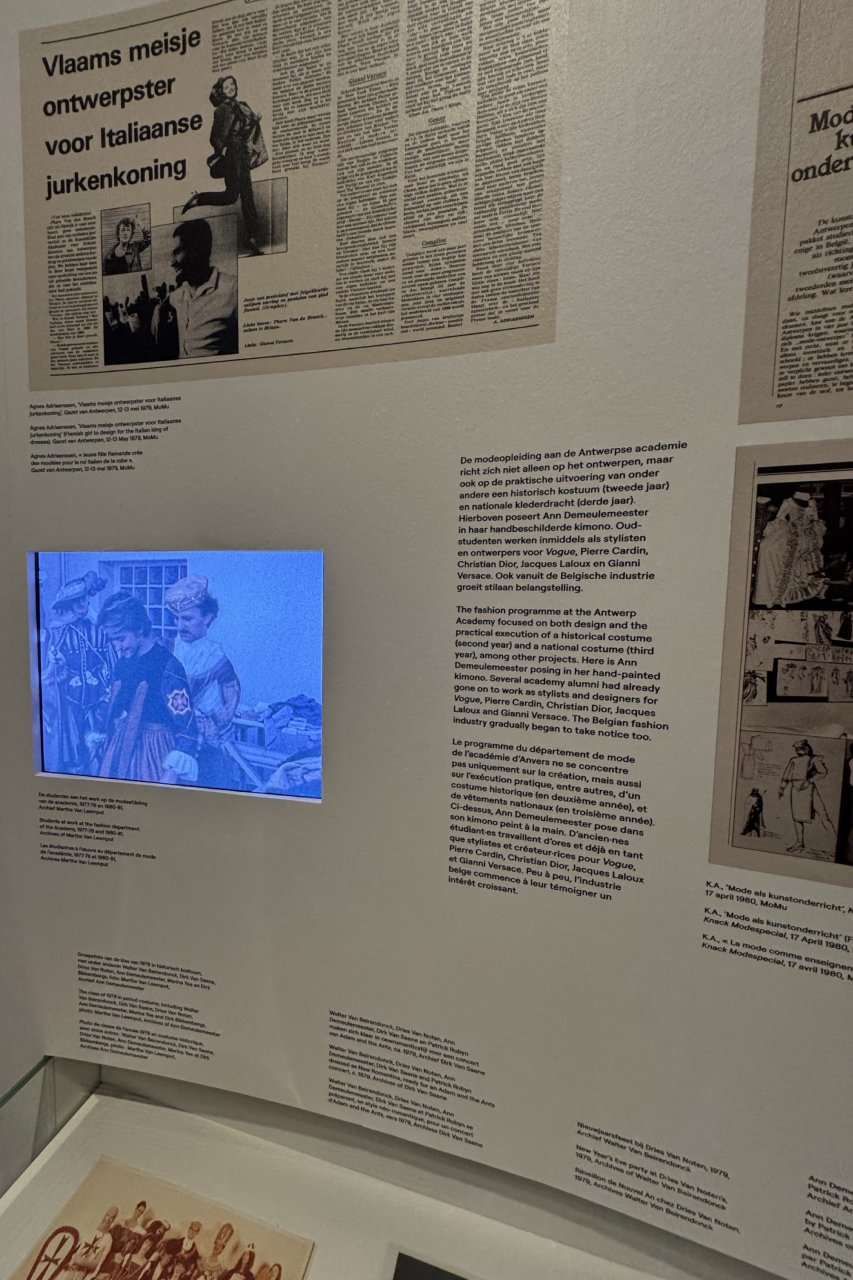 展覽的一開端便先導引六君子當年成長的社會歷史背景。1965-75 年是個充滿反叛的文化動盪時期,當時的歐洲歷經著反抗權威和傳統價值觀,工人與學生運動不斷;同時也訴求言論與性自由,而音樂和藝術便成為一種充滿活力的抗議手段。大約在此時(1963),安特衛普皇家美術學院開設了時尚學系,由 Mary Prijot 主導,儘管初期仍以製作戲服為主,但她對經典與紀律至上的嚴謹教學,奠定日後六君子無可撼動的結構和技藝基礎;隨後接任的 Linda Loppa 則強調概念和實驗,鼓勵並催生出他們各自的風格語言。