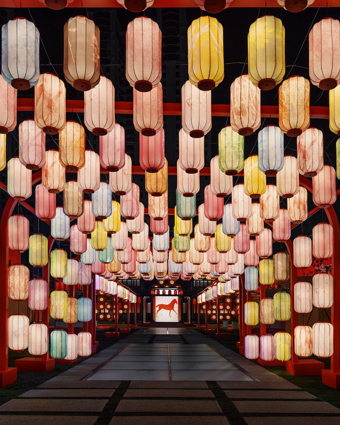 去街心 to Jane’s《東風夜放花千樹》以近似皮影戲的原理,將不同個性的駿馬剪影投影在電子煙火樹下,V 的型態被當作結構原型,透過中果傳統傢俱「馬蹄腿」的形式和大地相連。studiososlow《和合之形》由多盞風箏燈組成,以竹為骨,左右展開,呈現對於和諧、完整與前行的期待。