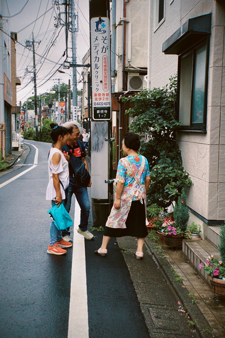 ↑ 「帶他們出國的時候要常常注意人跑哪去了,因為他們常常脫隊要跑去跟日本路人聊天。這張是他們突然和這位阿姨聊起她種的花,那個熱絡程度好像一群日本老人在聊天,結果聊回來問他們聊了什麼?我爸說:『喔那個阿姨自己講了很多我其實聽不懂。』」——豬豬