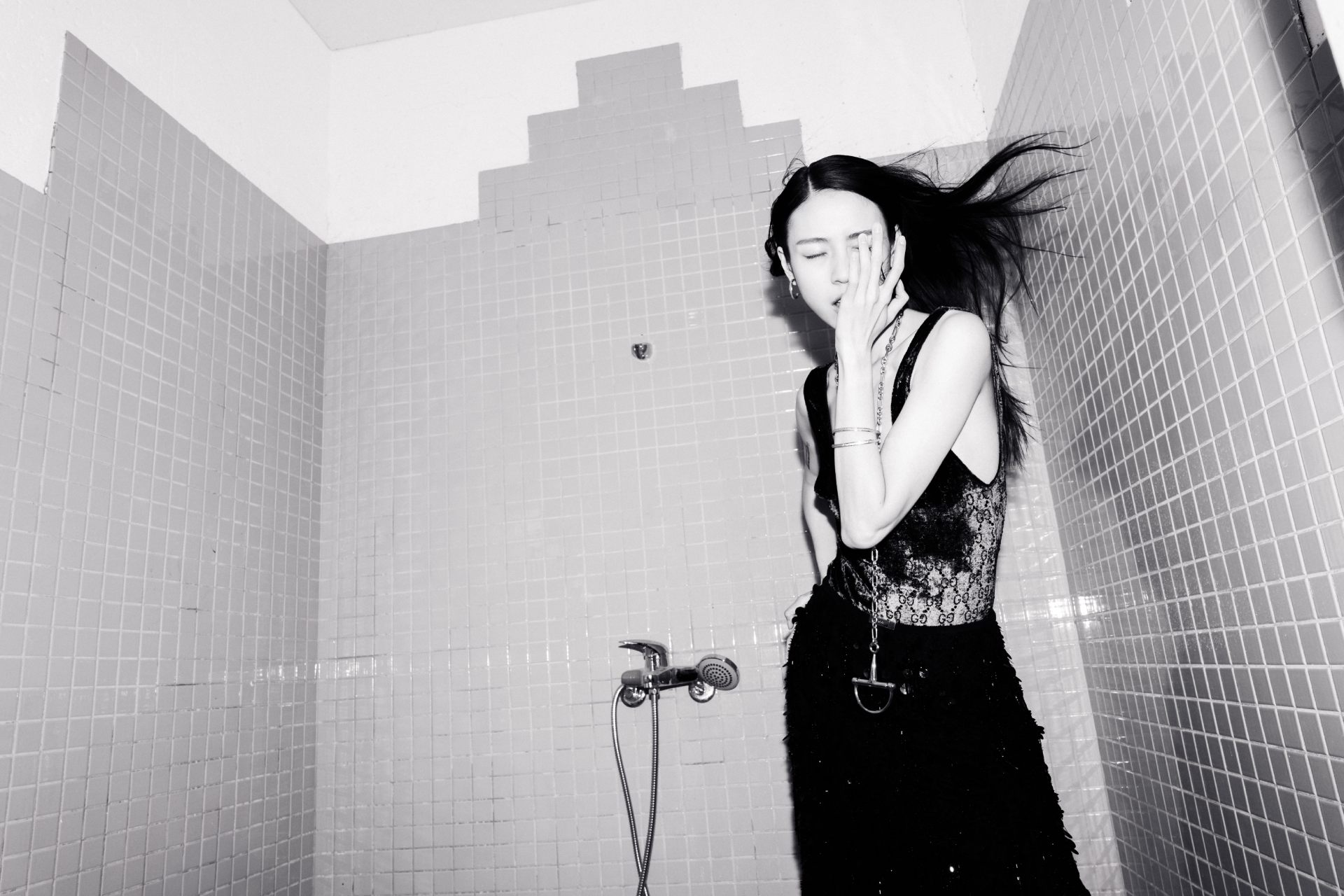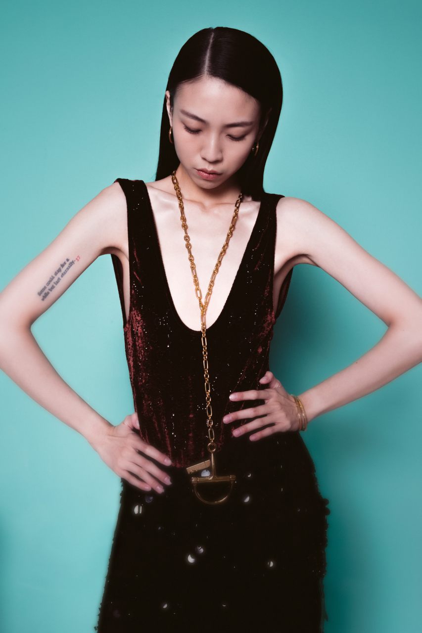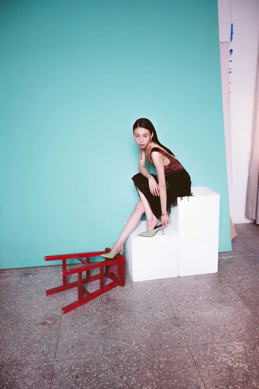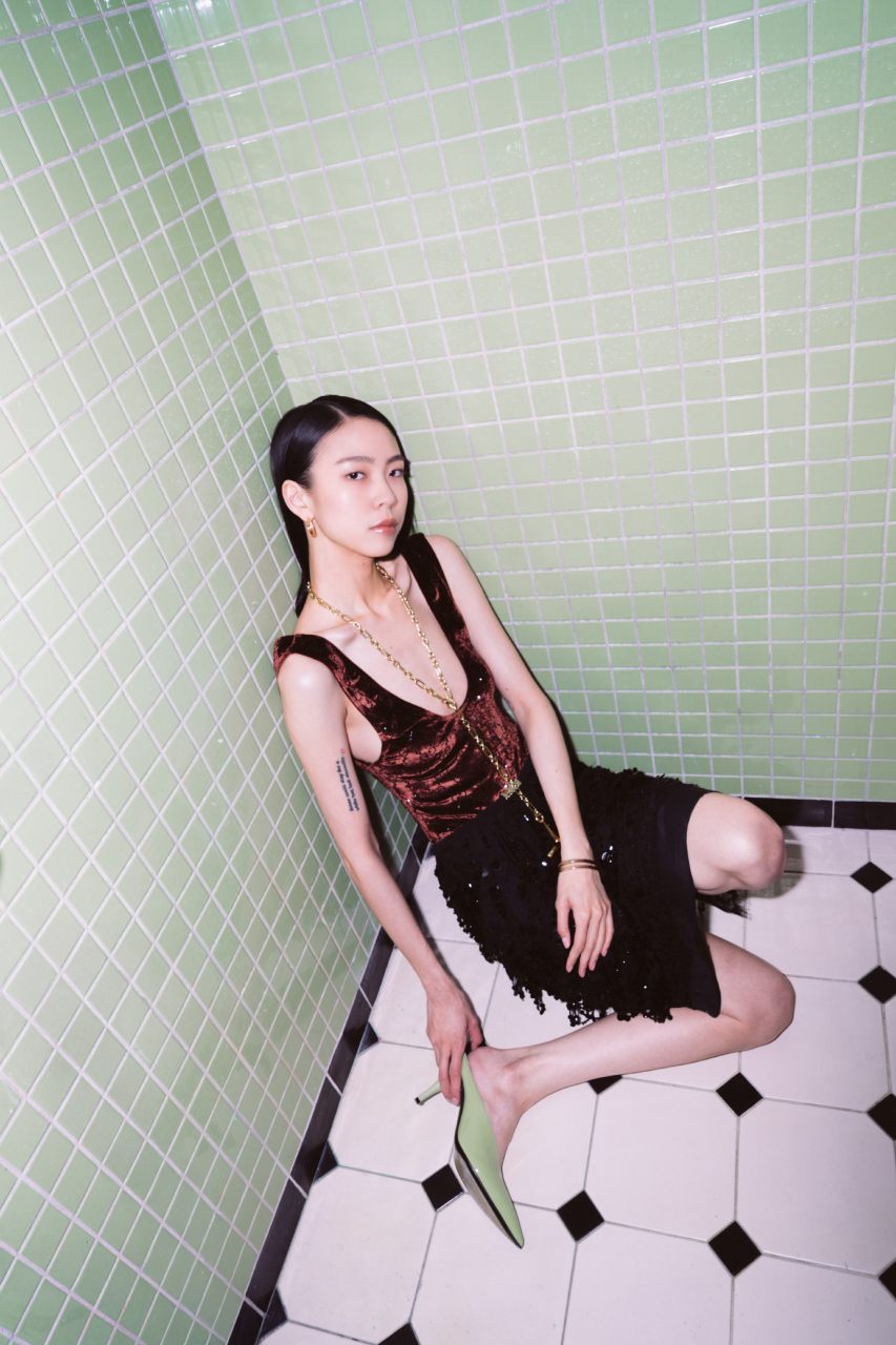 「但我意思是,我真的是這樣看待自己的,不覺得我有什麼特別標籤,就是很開放的人吧!很能接受不一樣的想法,不喜歡 judge別人。」纖長的手指在妝髮師的筆刷間找空隙揮舞。真要說最常評斷的,就是自己,「剛踏入模特兒行業時很迷茫,覺得自己什麼都不夠好,可能一輩子也沒機會碰到動態影像。」直到拍攝了男友的音樂 MV(順帶一提,她的男友是台灣樂團 JADE 主唱兼吉他手),「表演......感覺蠻好的。」