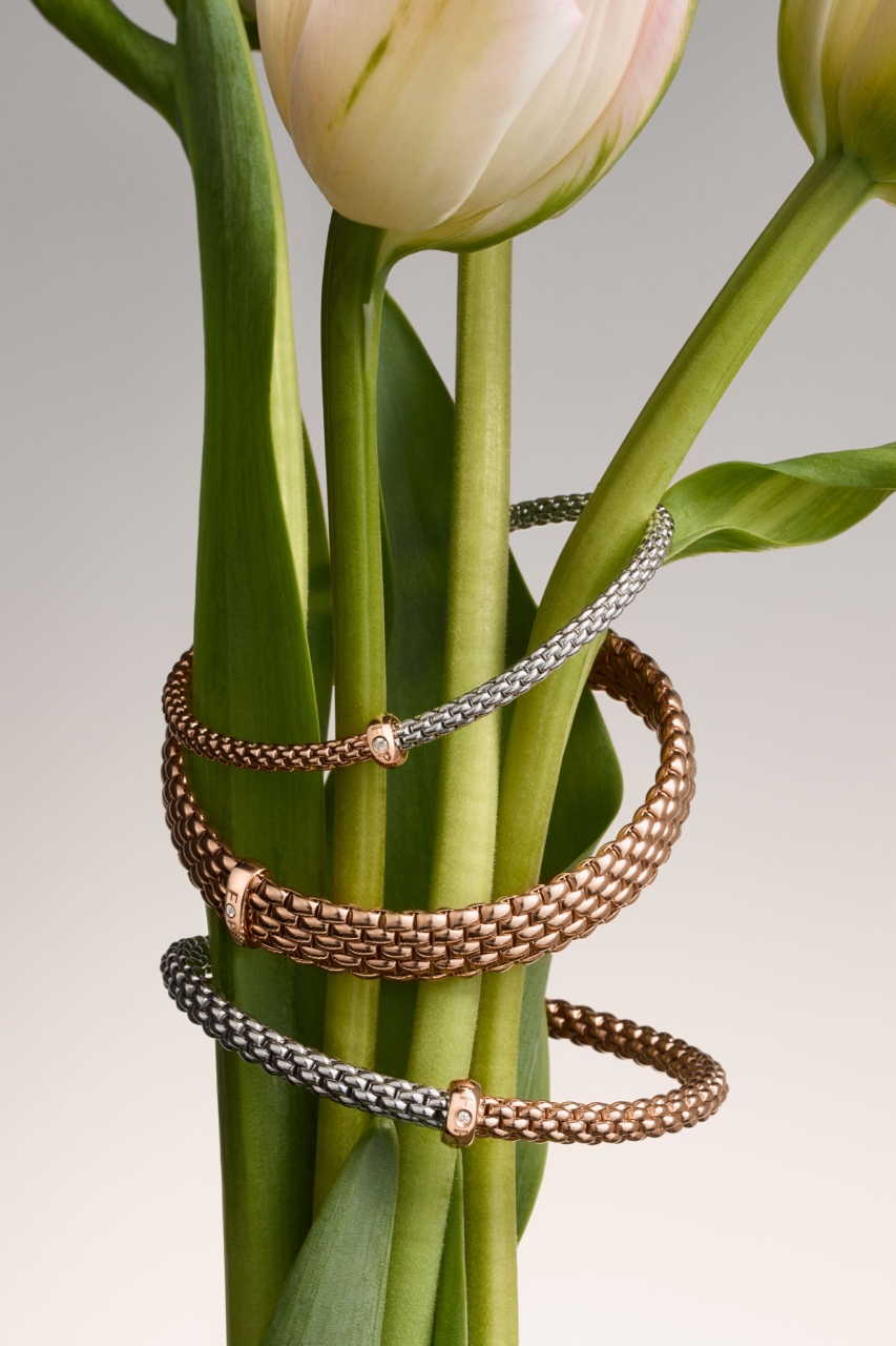 FOPE 標誌性的「Novecento 編織結構」誕生於 1980 年,藉由精密的金質元件扣合編織,全程無焊接也能行程柔軟穩定的黃金結構。2007 年,全世界獨一無二的「Flex’it 彈性技術」問世,品牌在 18k 黃金編織結構中嵌入微型黃金彈簧,使珠寶獲得理應不存在的延展性,在佩戴時可以如手鏈般套入手腕,重新定義珠寶的模樣。