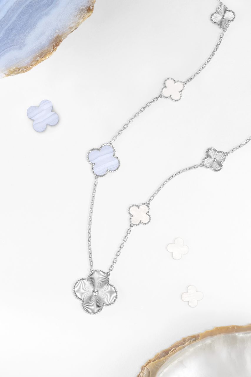 「Magic Alhambra 可轉換式長項鍊」首次為系列加入可轉換式設計,還可轉變為短項鍊或手鍊等多種配戴方式。15枚四葉幸運圖騰看似錯落,實則被精心排列,達到最完美的垂墜度與平衡。一款以灰、白珍珠母貝與璣鏤玫瑰金打造,如冬日壁爐裡的火光,內斂堅韌;另一款則由璣鏤白K金、玉髓、白色珍珠母貝,仿若清晨的雲彩,浪漫流轉,為優雅賦予更多面向。