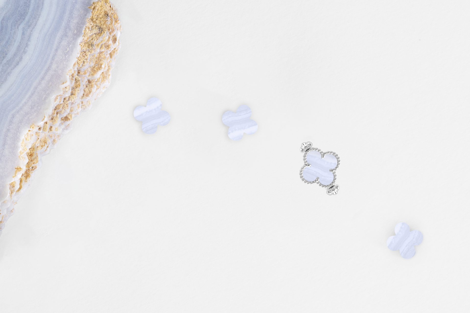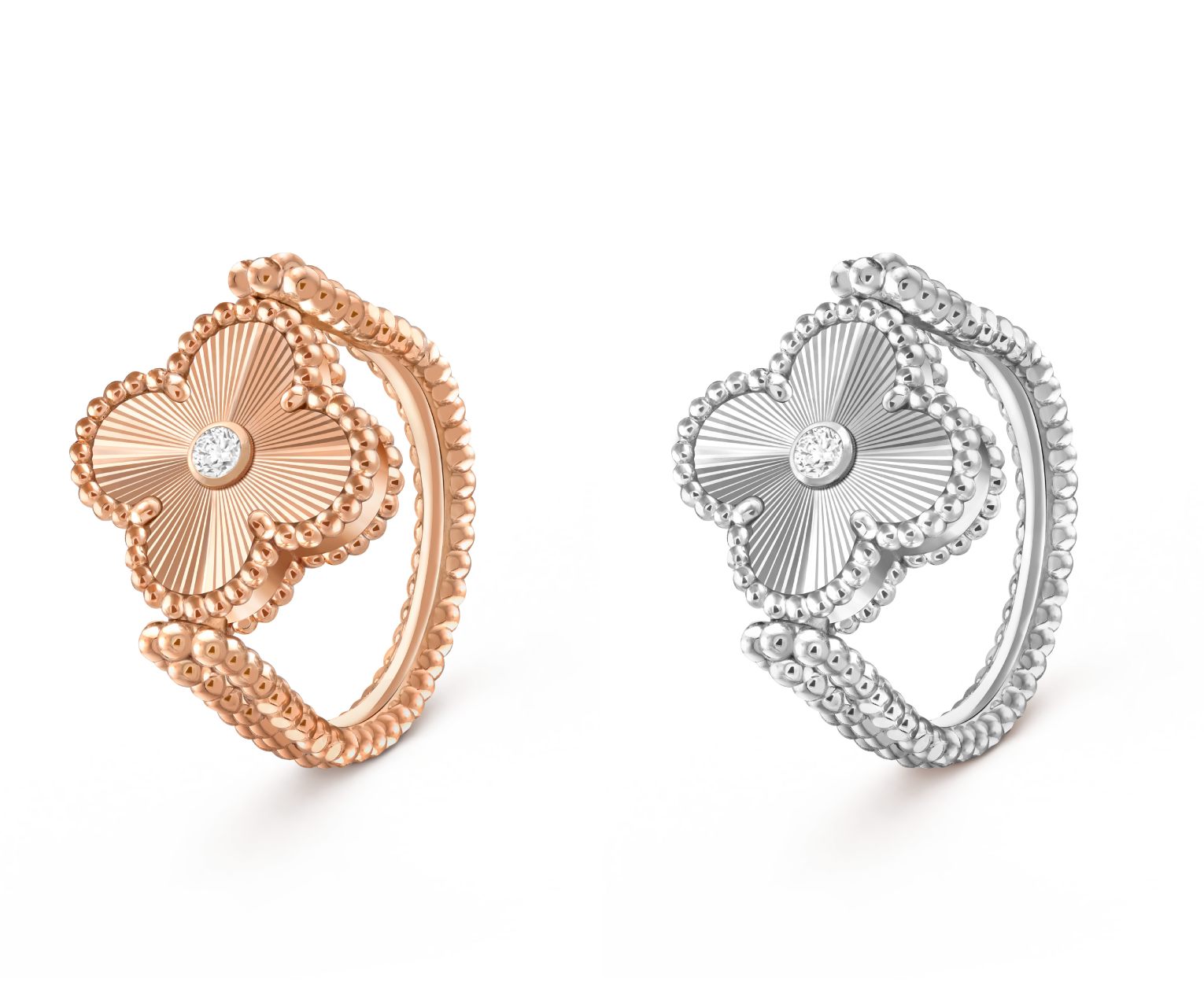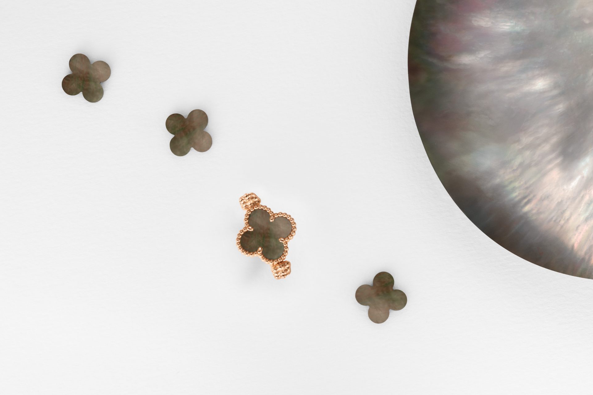 「Vintage Alhambra 雙面戒指」將配戴珠寶的日常昇華為藝術。四葉幸運圖騰以綻放銀灰華彩的灰色珍珠母貝,或帶水波紋色澤的玉髓呈現;反轉圖騰後,一顆燦爛美鑽流暢地躍然而上,與璣鏤刻紋玫瑰金或白K金相映,也彷彿回應著配戴者對美好來年的心願。