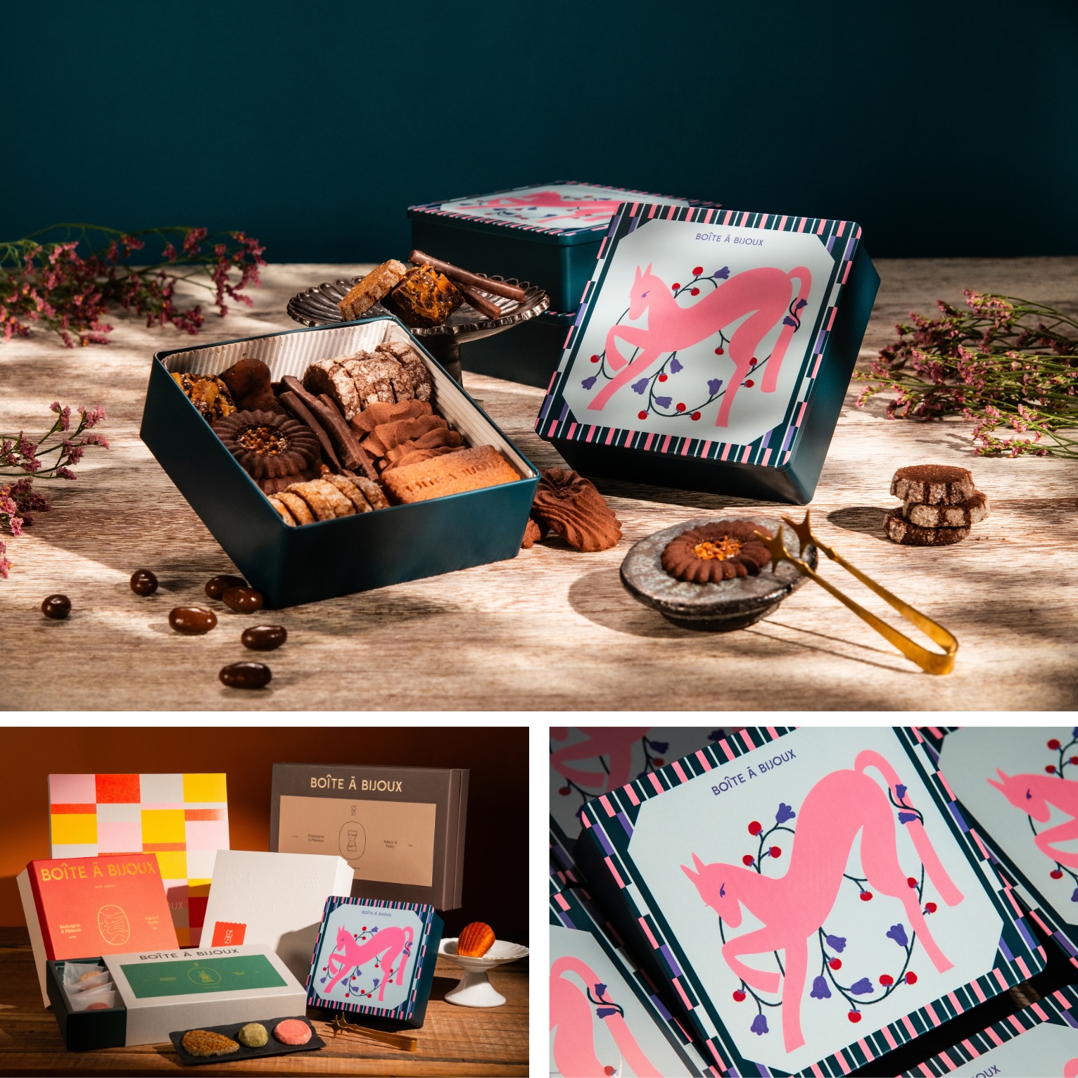 以可可為核心,來自珠寶盒法式點心坊的2026馬年法式醇黑餅乾禮盒,將巧克力的深淺層次化為一場細緻溫暖的年節提案。九款融入巧克力元素的點心,從柔和甜感到濃郁可可香氣,鋪陳出一條耐人尋味的風味曲線,而且處處藏著小驚喜。專為 2026 馬年打造的限定小馬鐵盒,以粉藍色調呈現,沉穩中帶著恰到好處的可愛氣息,帶來有如獨角獸般的誠意祝福。禮盒內精選九款巧克力點心:花圈造型的巧克力羅蜜亞,以焦糖杏仁內餡堆疊出細膩層次;經典的可可佛羅倫提,將焦糖與杏仁片烘烤至金黃酥脆,甜香濃郁;焦糖榛果巧克力沙布列則在焦糖、榛果與巧克力之間取得完美比例,風味溫潤而不厚重。搭配可可奶油酥餅、巧克力薄布列餅乾、巧克力雪球、橘條巧克力等多樣選擇,讓每一次取用,都像重新認識可可的另一種模樣。
