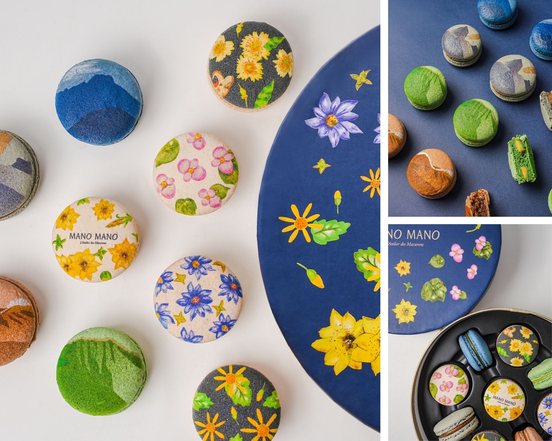 MANO MANO 把新年禮盒,做成一段能被世界理解的島嶼敘事。2025 年 10 月,品牌受邀前進巴黎巧克力沙龍展,以融合台灣風味與精緻造型的馬卡龍,在國際舞台留下鮮明印象。《島嶼之味》新年禮盒,正是這次巴黎經驗回到台灣後的延伸,讓節慶甜點呈現清楚的文化輪廓。九入馬卡龍以五款花卉與四款山形描繪台灣自然風景:阿里山龍膽花、太魯閣千里光與台灣特有種猴歡喜,象徵堅韌、光明與祝福;玉山、大霸尖山、雪山與南湖大山則以金銀細節勾勒雲海晨光,排列起來宛如九枚島嶼座標。風味上,MANO MANO 以台灣茶為核心,結合紅心芭樂包種茶、蜜桃高山烏龍與桂圓凍頂烏龍,讓茶韻與果香層層展開。