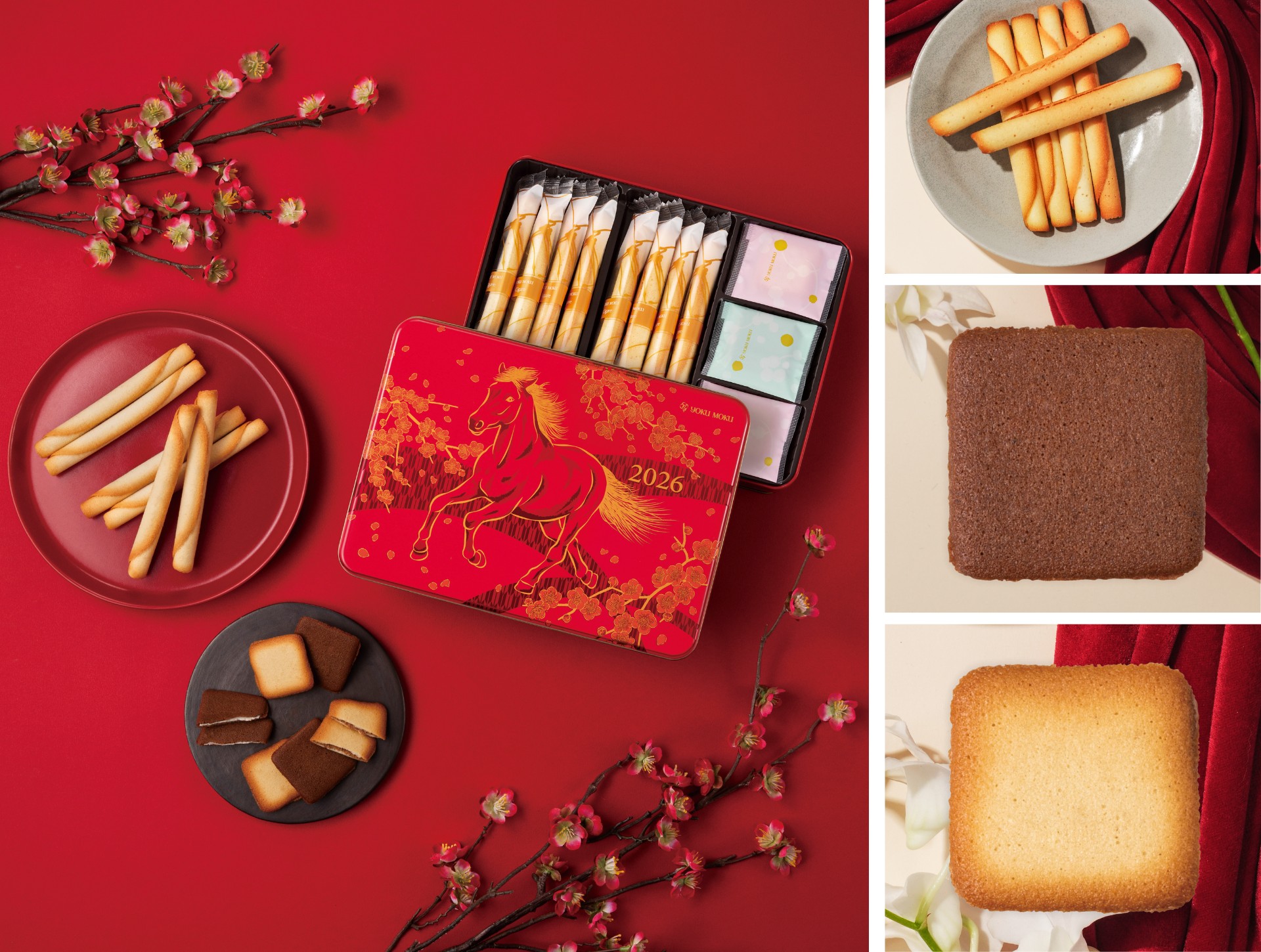 為新年贈禮賦予一眼即識的優雅符號,是日本 YOKU MOKU 的款款心意。專為2026馬年設計的禮盒以「駕馭希望之春」為題,將疾馳的駿馬、綻放的日本梅花與寓意吉祥的日式箭羽紋樣,凝練於富貴紅金禮盒之上。這份來自東京的洋菓子禮,從視覺到味覺皆充滿新春的講究。禮盒內珍藏著款待上賓的味覺選擇:原味雪茄蛋捲以精準工法呈現入口即化的酥鬆奶香,是永不褪色的節慶經典;新春限定的楓糖雙層牛奶巧克力餅乾,讓楓糖的暖甜香氣包裹絲滑巧克力,充滿冬日幸福感;全新可可雙層白巧克力餅乾,則以醇厚可可風味勾勒出大人感的優雅甜韻。YOKU MOKU 迎春禮盒不只傳遞喜氣,更讓每一口分享,都成為日常裡悄悄提升質感的片刻。