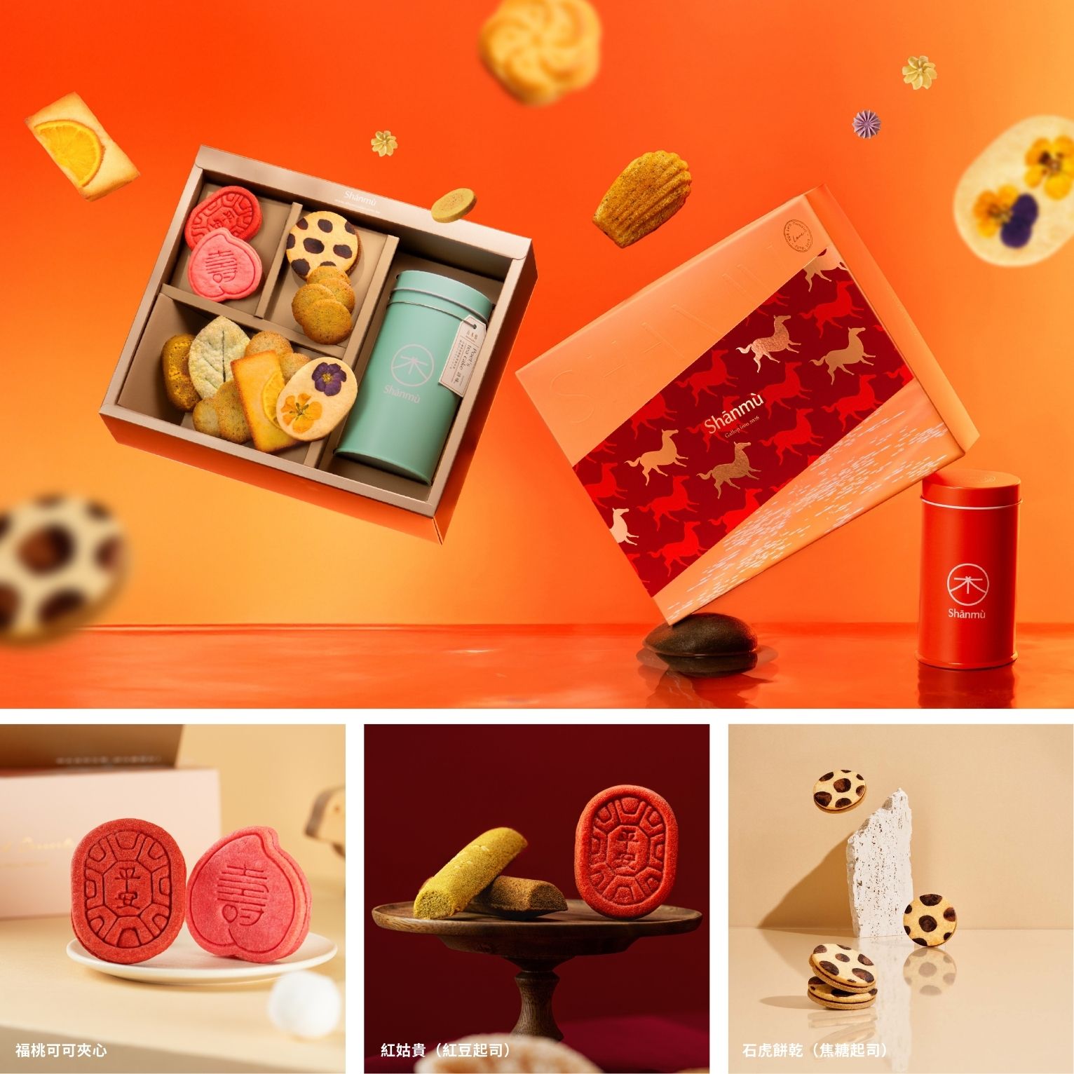 想像一下,新年開春第一天,清晨的曙光慢慢地灑在臉上,一股擘畫新局的力量在內心發芽。這是「Shānmù 山木島」帶來的祝福。新年限定禮盒「金池暖洋」從海平面上的晨曦獲得靈感,搭配馳騁於金色浪面的金馬封套,寓意「心之所向,自在啟程」。禮盒點心巧妙結合台灣傳統與西式甜點:以趣味壽桃造型呈現的「福桃可可夾心」夾入濃郁滑順的可可內餡,甜而不膩;以紅龜粿為靈感的「紅姑貴」結合細緻紅豆內餡與溫潤起司風味,甜鹹層次分明;帶有搶眼斑紋的「石虎餅乾」揉合濃郁起司與溫潤焦糖風味,口感豐富而不膩。風味與故事兼具,新年最溫暖的開場非「Shānmù 山木島」莫屬。