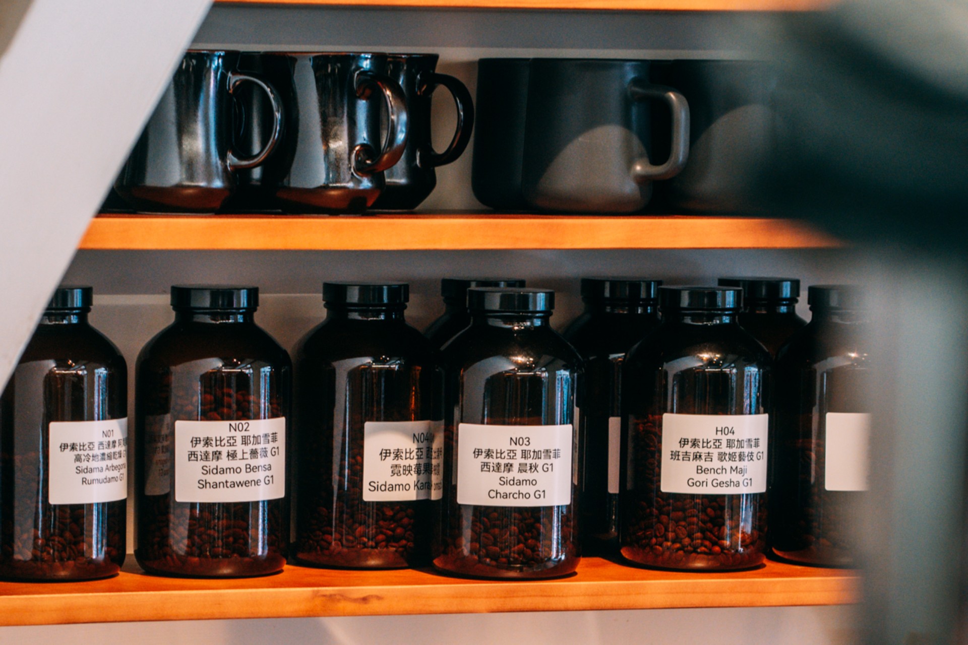 ↑店內架上陳列著衣索比亞莊園的咖啡豆