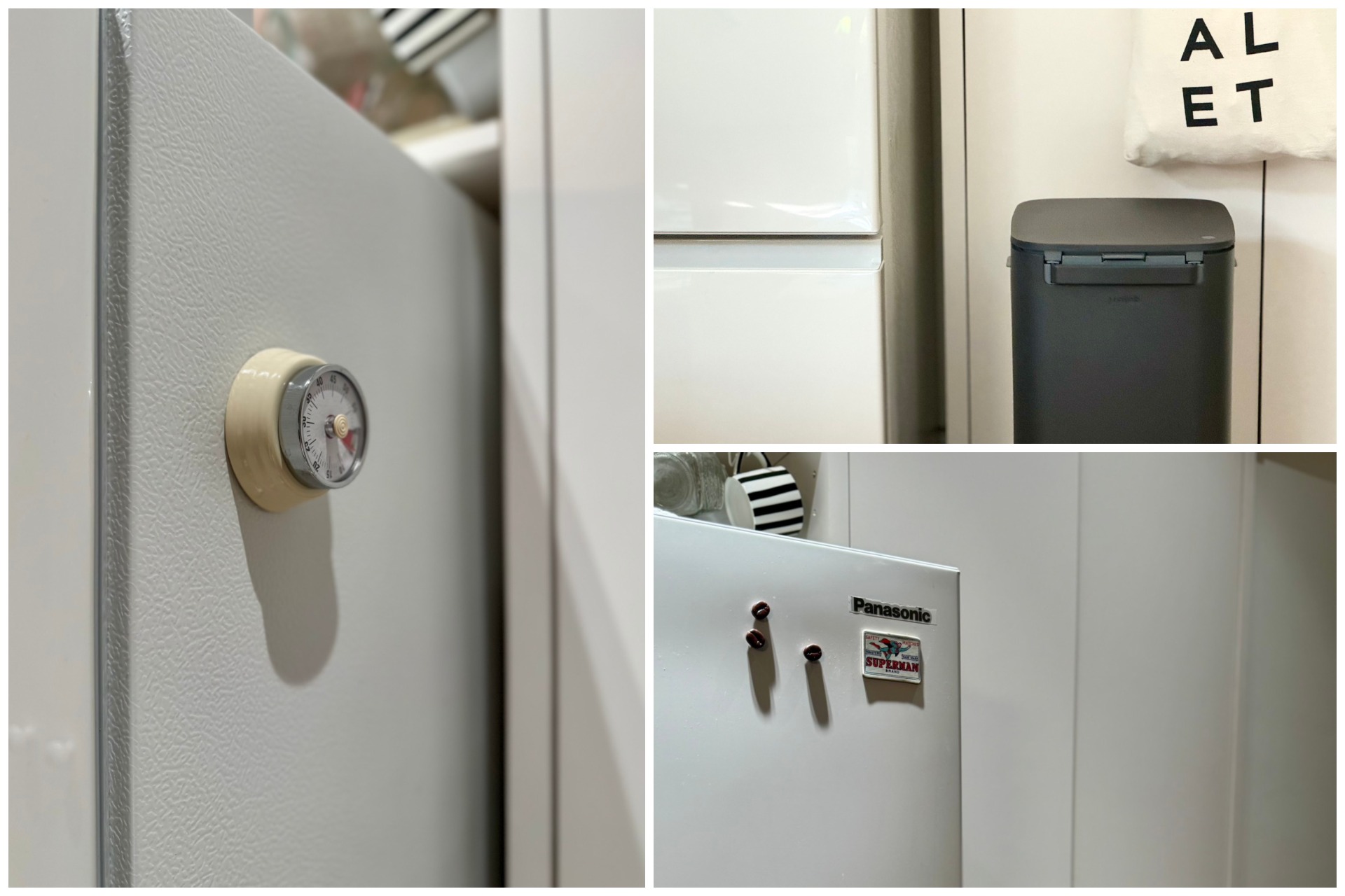 玫瑰白油漆的整面櫃牆,與一旁冷白色的電冰箱相鄰,再搭配上奶油白的小圓門把與復古計時器。乍看之下是一片的白,但藏著深深淺淺的變化,安靜中自帶著熱鬧。偶爾再擺上一盆小白花,都能添加新鮮的樂趣。