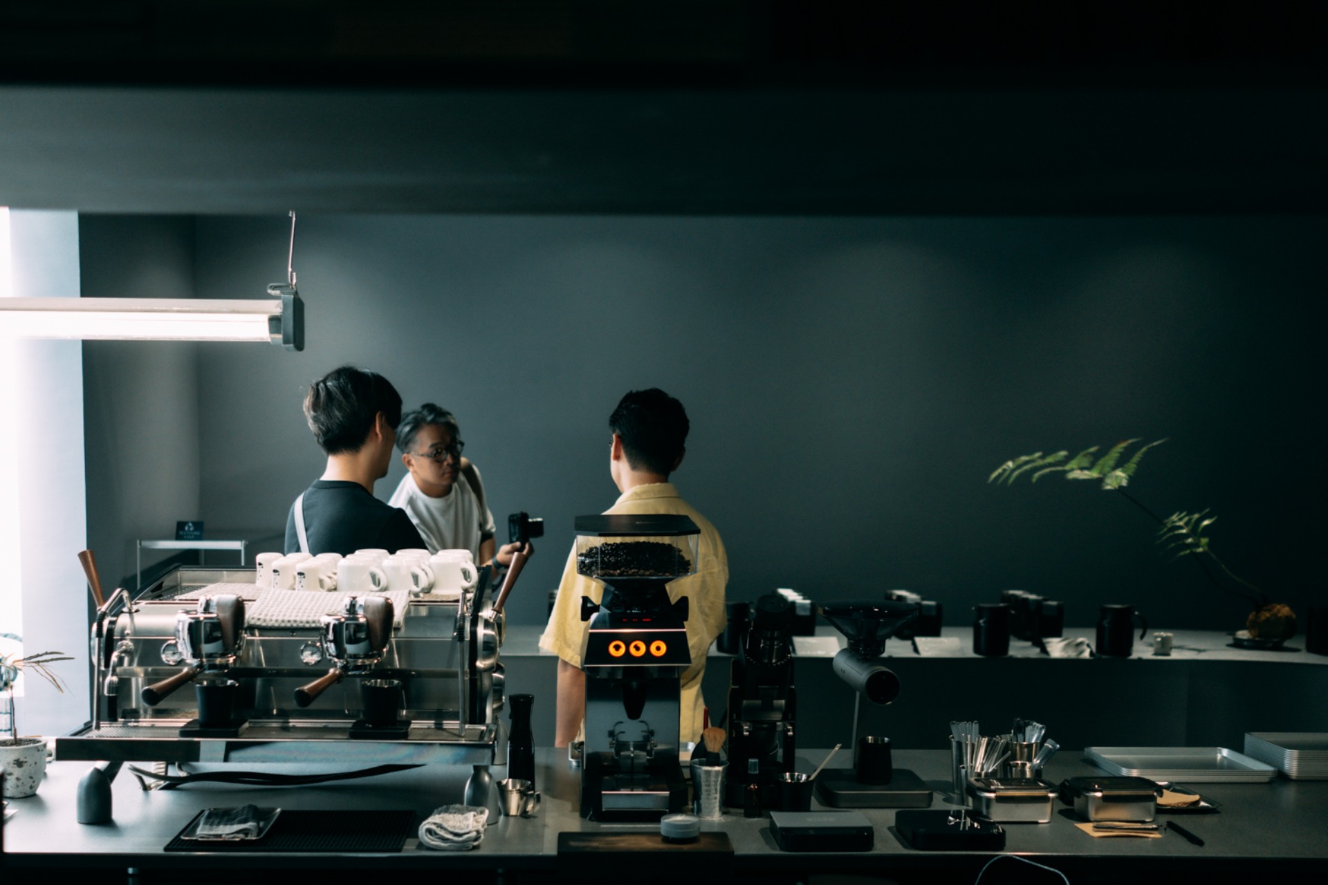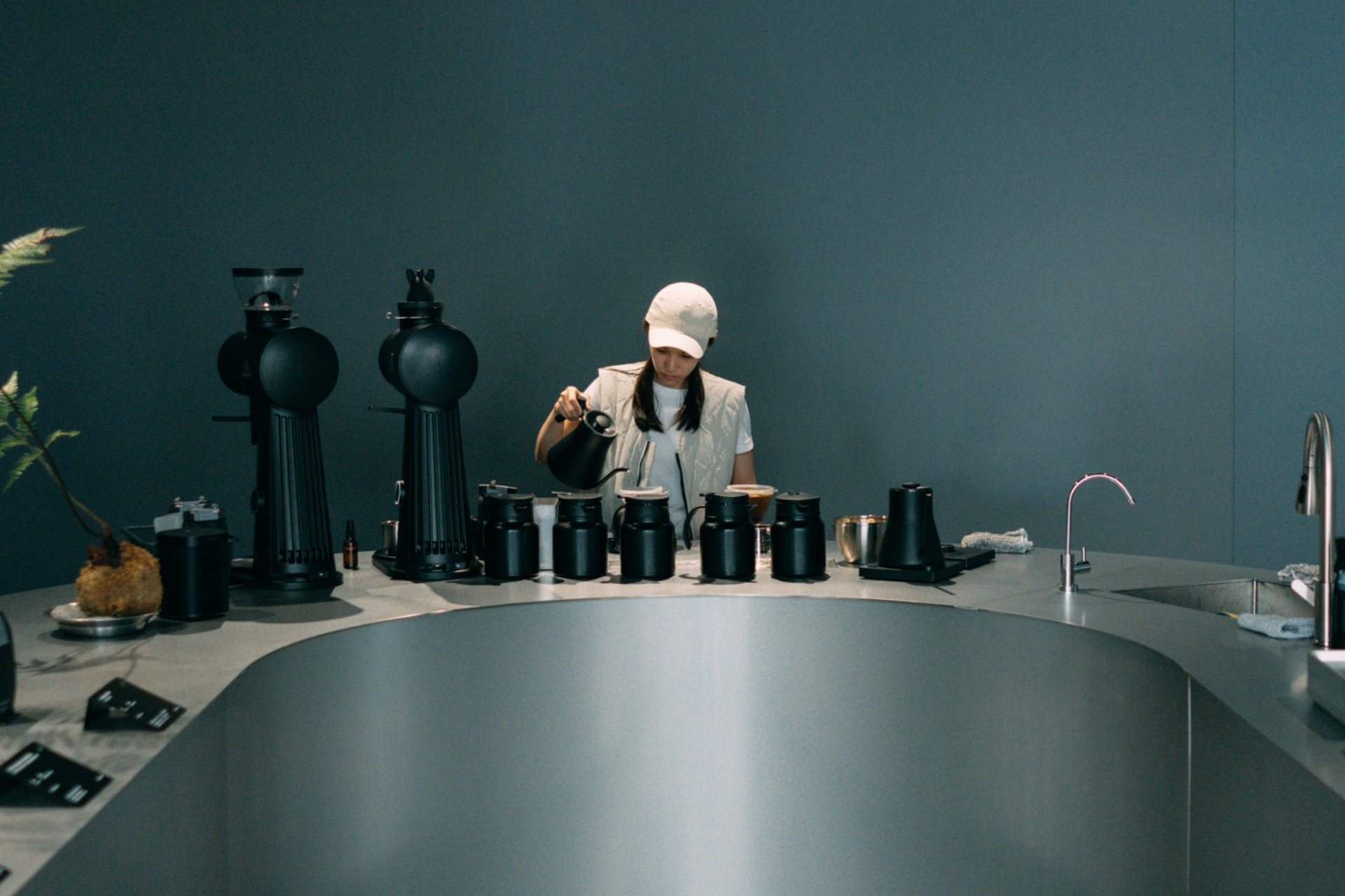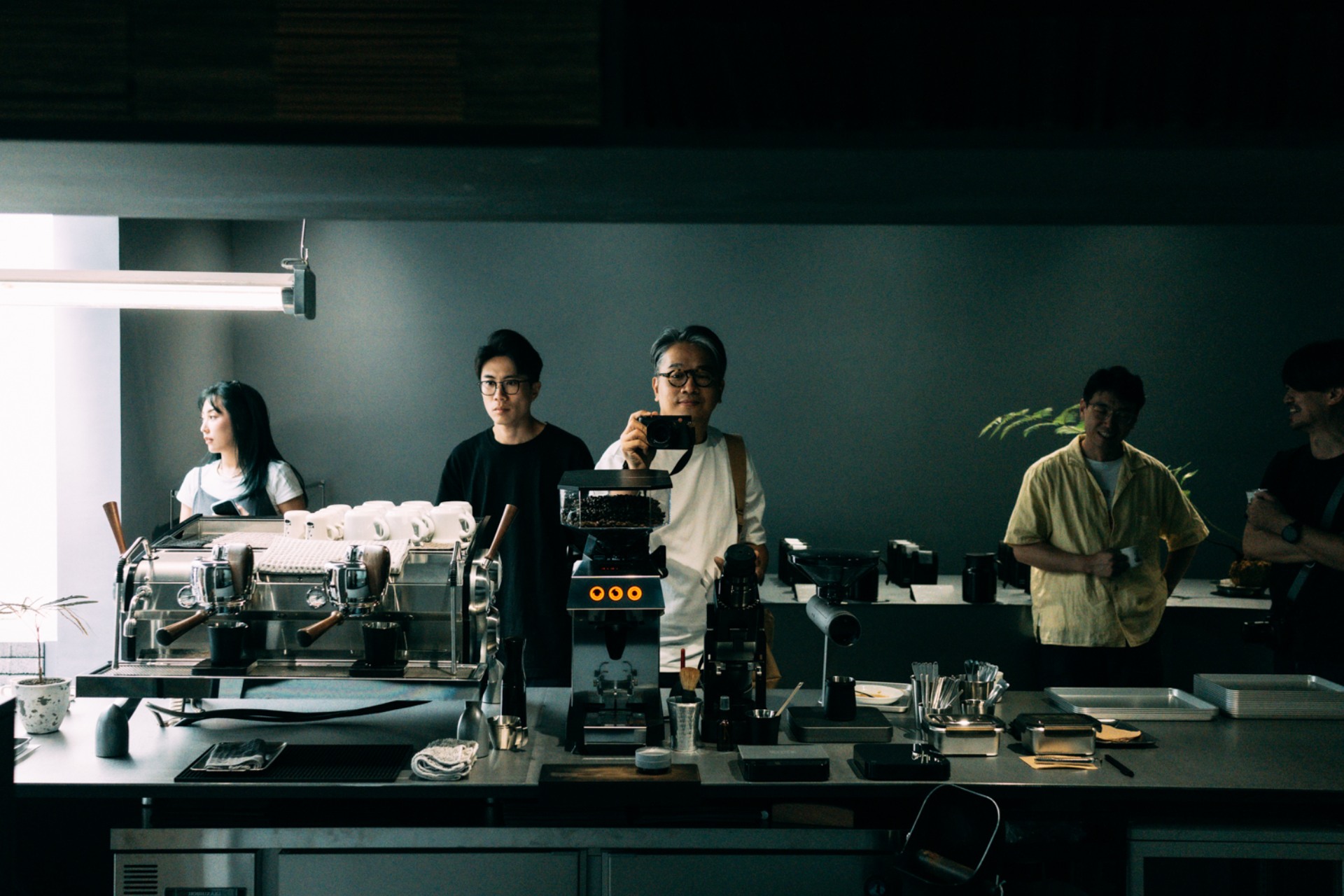 相對於純樸的街道,低調的灰銀色立面,在大溪街上的店所確實有點未來異世感的存在。一入門的灰暗的空間,中央天井溢下的自然光,如同聖光普照般成為最佳的引路光景。長深的空間,最底端是大型的 U 型鋼製吧台,承載著 Slayer Espresso & La Marzocco Swan 的俐落線條組合。延伸至弧頂,中央的視覺落在手沖吧台,專注地萃取著每一杯的精華。使用著 TOAST Living 的 Trio 三重奏浸泡式咖啡濾杯,能更穩定地萃取,讓每杯咖啡都能帶給客人最好的品嘗感受。