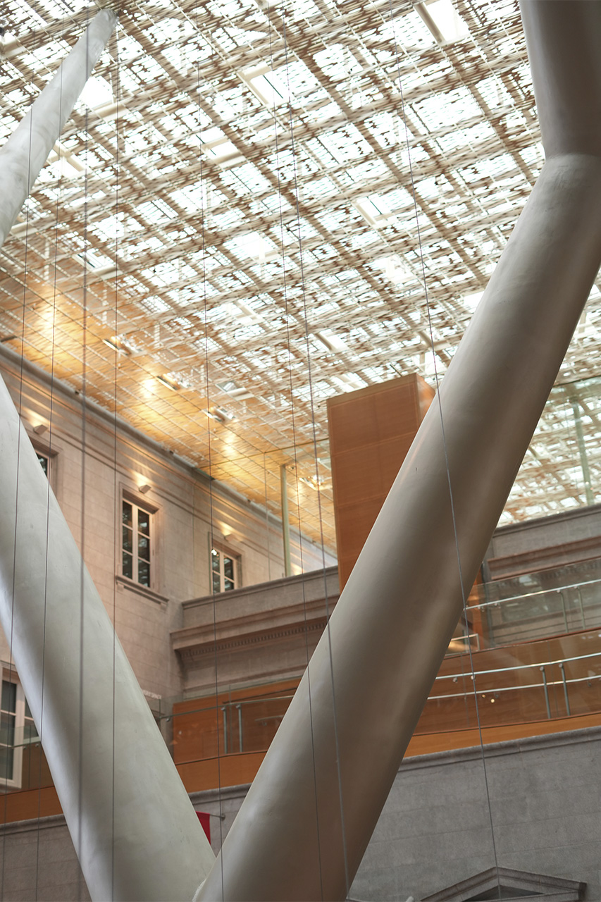 我喜歡逛美術館,因為它代表著一個城市的底蘊。National Gallery Singapore 提供了這樣的入口,讓前來的旅人如我能輕盈地探訪。將前市政廳與最高法院的兩座古蹟融為一體,以玻璃及鋼材打造的屋頂串聯,自然光如瀑布飛瀉,落在石牆、階梯與雕像上,像預設排程的光影實驗。