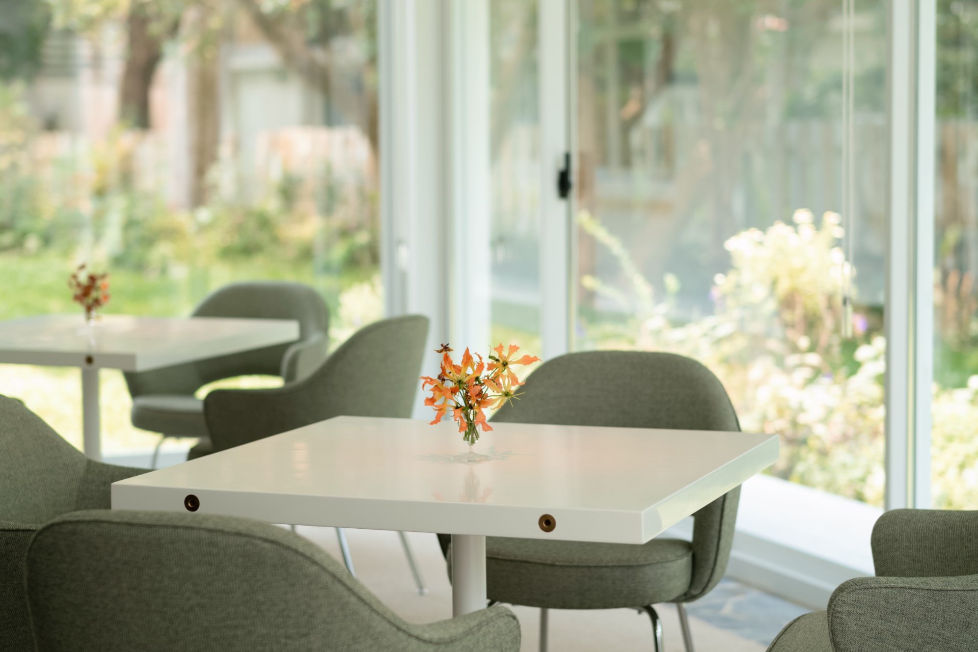 ⭡在室內享用著跨國界的美味佳餚,窗外是綠意盎然的加州美式庭園