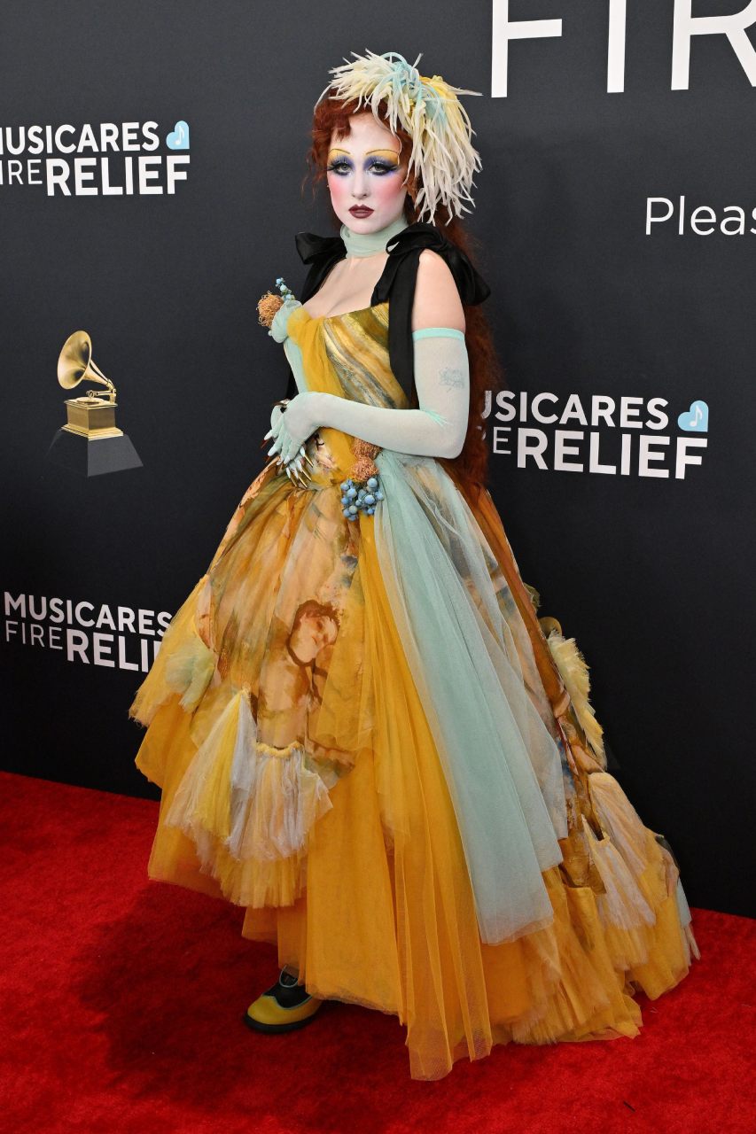 新生代酷兒歌手——Chappell Roan 再度為葛萊美獎紅毯創造經典的歷史時刻!她穿上 Mugler 紅褐色透膚雪紡禮服,拿下披肩後,幾乎上半身全空,僅留下乳環裝飾垂吊著布料,極具張力的前衛風格震撼全場!