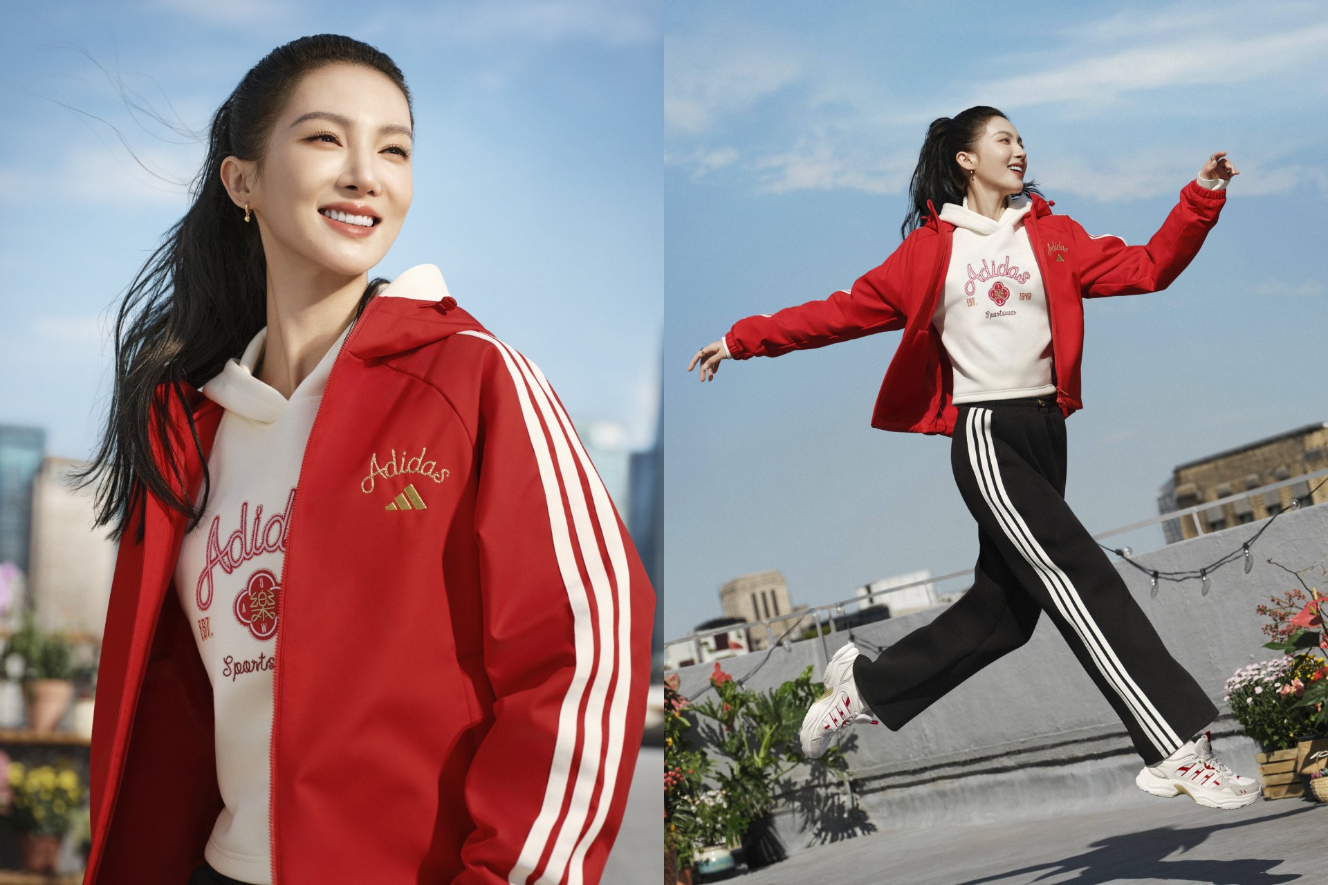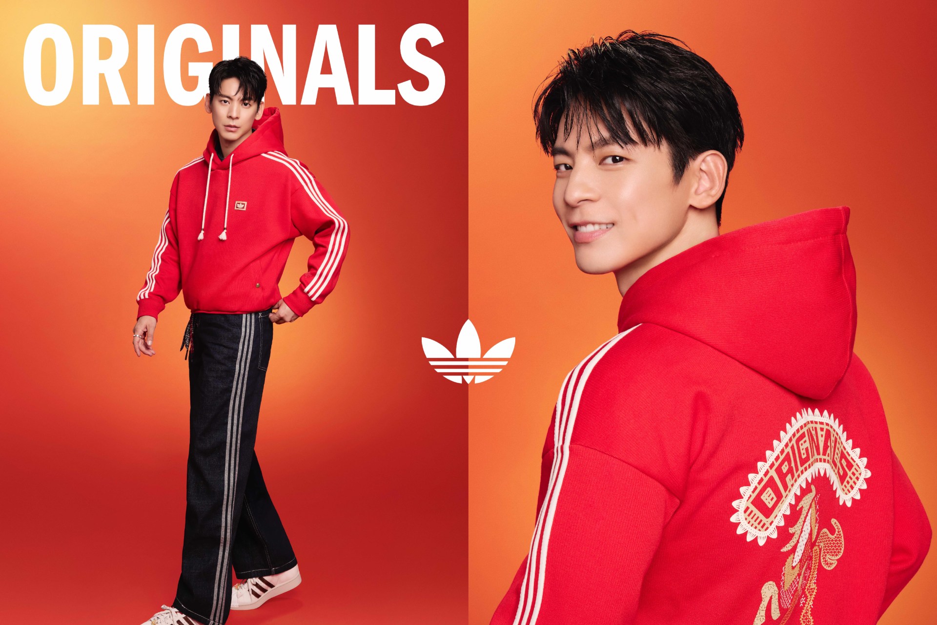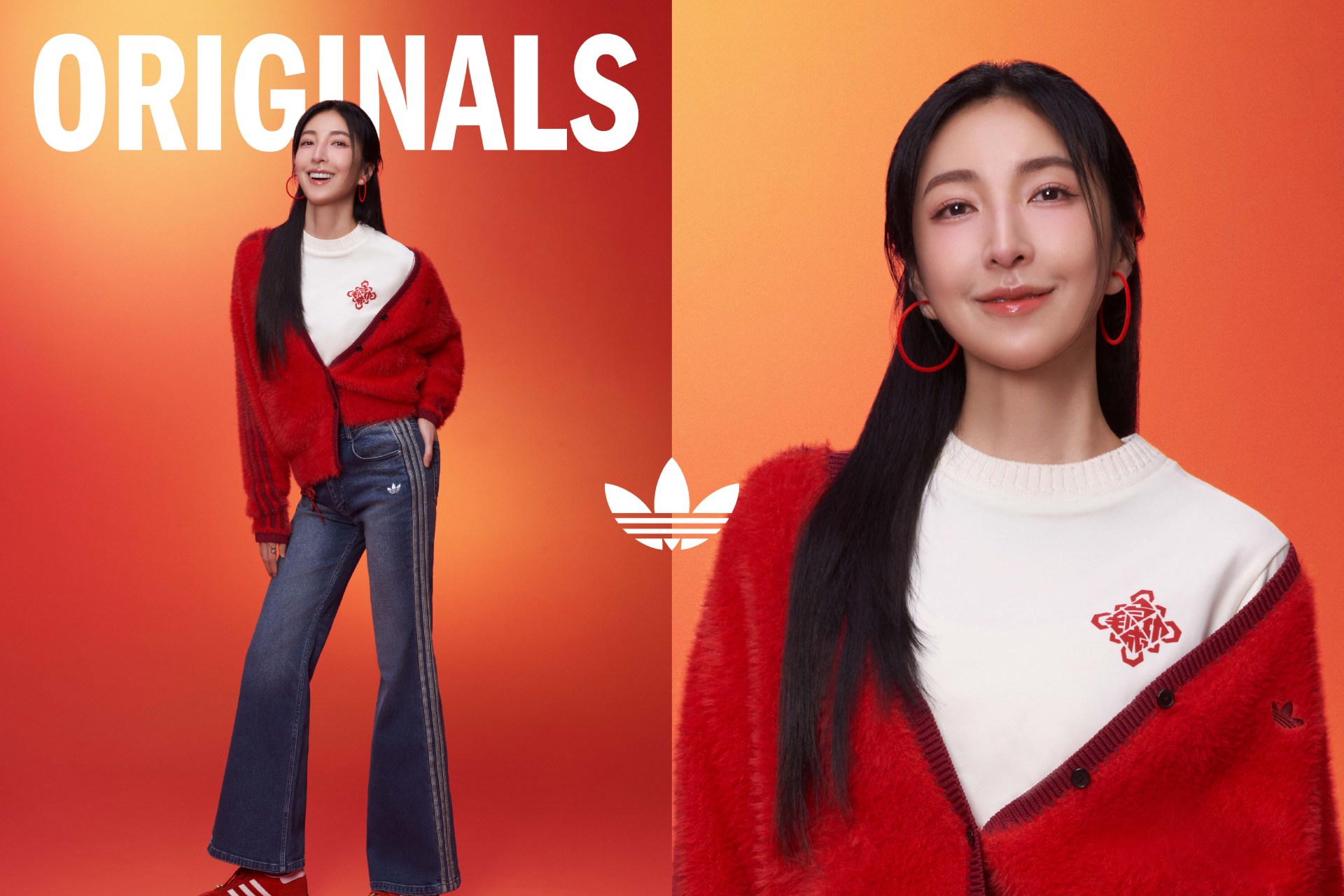 形象大使林柏宏演繹多層次風格!在 adidas 新年限定系列中,他以黑紅新中式絎縫外套搭配 XLG STORM EDGE CNY 老爹鞋;在 adidas Originals 新年限定系列則身披「萬家衣」靈感的拼接針織外套,腳踩奶油白 SUPERSTAR II,展現街頭魅力。金鐘影后楊謹華著用 adidas Originals 新年限定系列,以紅色撞毛絨外套或米白翻領上衣,搭配修飾比例的復古丹寧褲與磚紅 HANDBALL SPEZIAL 鞋,金色馬蹄扣是影后級的時髦亮點。