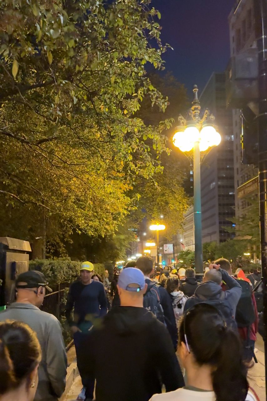 走在漆黑的密西根大道上,身邊盡是來自世界各地的跑者。手錶這時跳出朋友們傳來的加油訊息,頓時暖心滿點。再度通過安檢,進入集合場域,寄物順利完成(幾乎不用排隊)。但就在如廁後,那份激動與興奮的情緒忽然間靜了下來,那是一種安定的感覺。嗯,我準備好了!