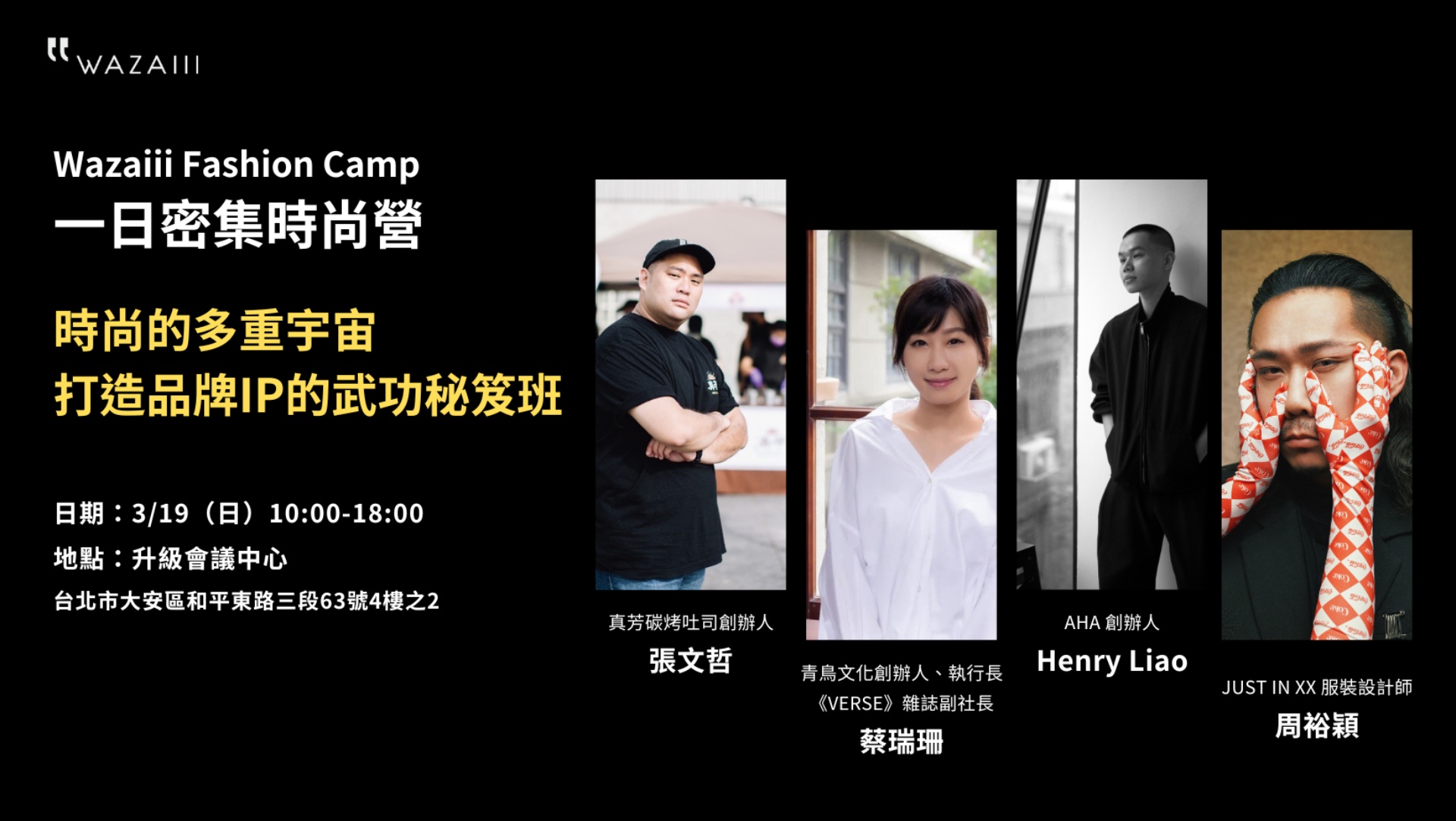 Wazaiii 一日密集時尚營特別邀請到各界重量級的講師,從不同產業面切入,包含:知名真芳碳烤吐司創辦人張文哲,將自身的觀光經驗融合成翻轉台灣味的創意早餐型態,以個人力量突圍,打造出有在地特色且有品牌故事的餐飲企業。青鳥書店創辦人蔡瑞珊以一家書店之姿,開啟台灣書店獨有的青鳥文化,打造獨特的閱讀品牌,成為藝文界獨有的品牌平台。擅長打造品牌與經營個人平台的 AHA 創辦人 Henry Liao 在他的精準創意的推動下,成功打造許多社群紀錄。享譽國際服裝設計的周裕穎以 JUST IN XX 為台灣第一個獲選進入紐約官方時裝週的品牌,,屢創跨界話題。